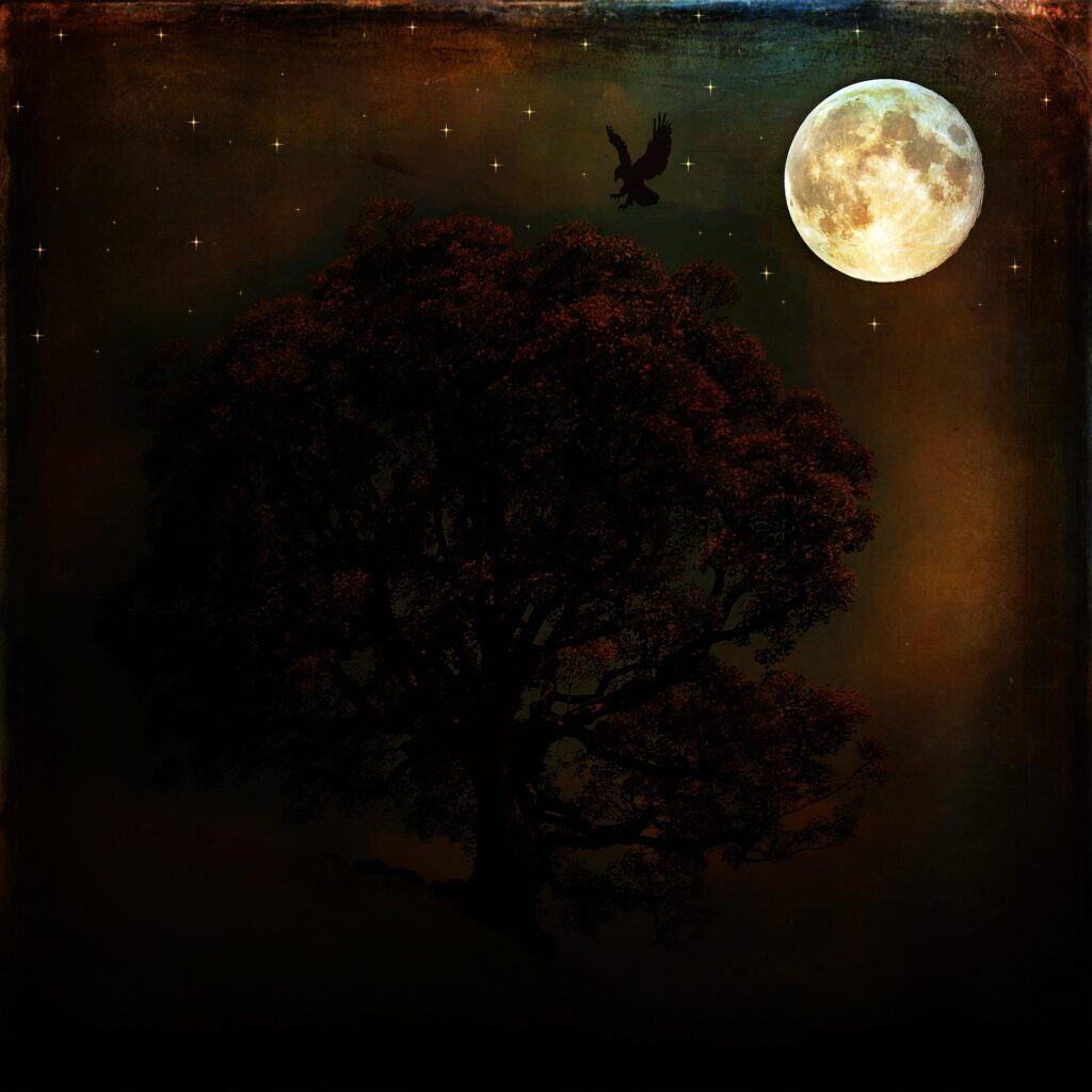 This means using very little paint on your brush or sponge and lightly brushing it over the canvas. The magic here is in the silhouettes. You paint solid, dark shapes of things like a lonely bird or a calm lake in front of the moon.