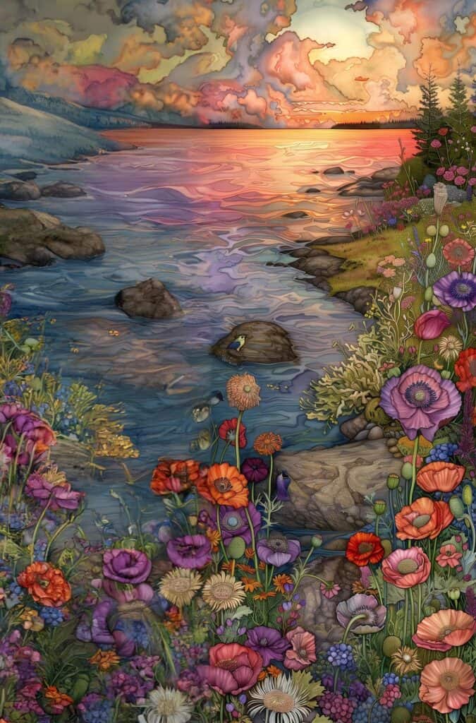 Do you love the idea of capturing a whole beautiful scene? This concept combines two wonderful things: landscape and florals. You’ll paint a wide body of water, like a calm lake or ocean cove, with a gorgeous cluster of vibrant flowers in the foreground.
