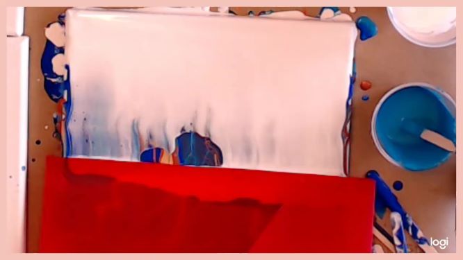- Tilt your canvas slightly so that which would be the top of the painting is higher than the bottom. At the top, pour your paint very slowly and close to the canvas, moving in a very slight, small circular motion. (See note below and second video below.)